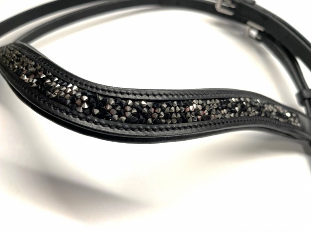 Hodelaget har wave-formet, bred pannereim, og både pannereim og ergonomisk nesereim er polstret. Pannereim og nesereim består av det som fremstår som knuste, glinsende, sorte og sølvfargede stener (= cracled rock).