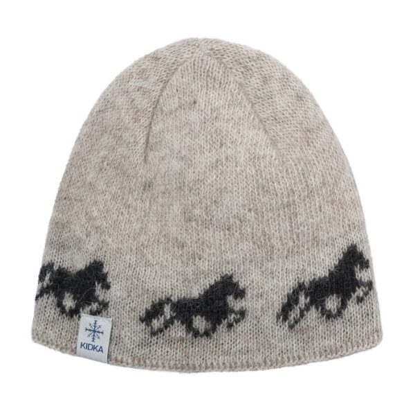 En vakker lue i islandsk ull med tøltende hester. Luen finnes i forskjellige farger, har linning/kant på innsiden i bomull, og har alle de gode egenskapene islandsk ull byr på.