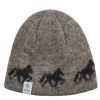 En vakker lue i islandsk ull med tøltende hester. Luen finnes i forskjellige farger, har linning/kant på innsiden i bomull, og har alle de gode egenskapene islandsk ull byr på.