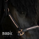 Lærgrime i kvalitetslær fra Nordic Horse i Danmark. Myk fóring på nakkestykket, nesedelen og kinnstykkene, samt rosegold spenner. Grimen er justerbar på begge sider av nakkeremmen samt ved nesedelen. Festes med karabinkrok.